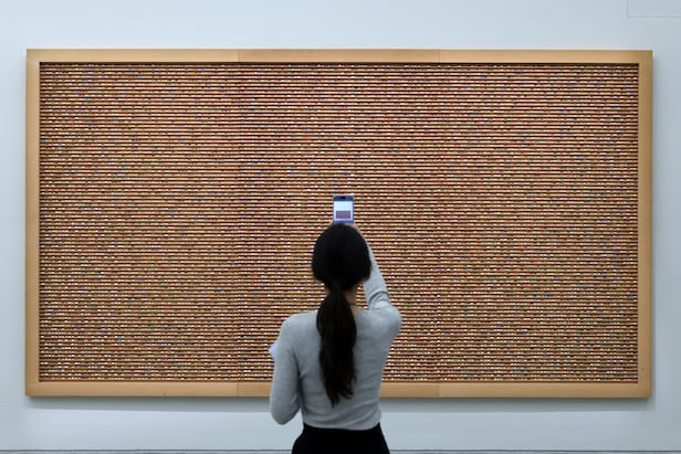 그 뒤에는 멀리서 보면 중세 성당의 스테인드글라스처럼 보이는 작품, 〈신의 무한한 권능과 영광을 묵상하며〉 가 있습니다. 가까이 다가가면, 그것이 수천 마리 나비의 날개로 만들어졌음을 알게 됩니다. 아름다움 속에 죽음이 깃들어 있는, 역설의 작품입니다.