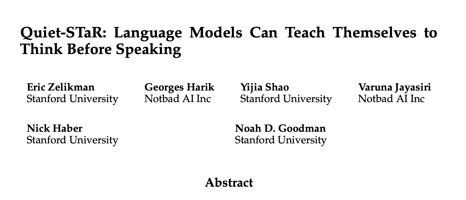 해당 논문은 스탠포드 대학교와 Notbad AI의 연구진이 개발한 'Quiet-STaR'라는 새로운 기술은 대규모 언어 모델(LLM)의 추론 능력을 획기적으로 향상하는 방법을 제시하고 있습니다. 이 기술은 언어 모델이 텍스트를 생성하기 전에 '생각'하는 과정을 스스로 학습할 수 있게 하여, AI의 추론 능력을 한 단계 더 발전시켰습니다.