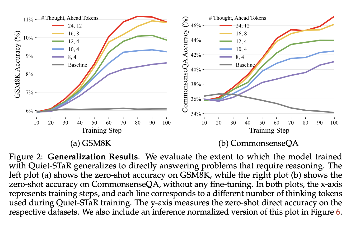 Quiet-STaR 가 제안한 방법은 다양한 웹 텍스트에서 학습하여 일반화된 추론 능력을 개발하고, '생각'하는 과정을 명시적으로 모델링함으로써 인간의 사고 과정에 더 가까워질 수 있는 가능성을 제시합니다. 특정 작업에 대한 미세 조정 없이도 성능이 향상된다는 점은 모델의 일반적인 지능이 향상되었음을 시사하며, Quiet-STaR가 기존의 체인오브솟(CoT) 프롬프팅과 결합하여 더 나은 성능을 보여준다는 사실은 다양한 AI 기술들이 상호 보완적으로 발전할 수 있음을 보여줍니다.