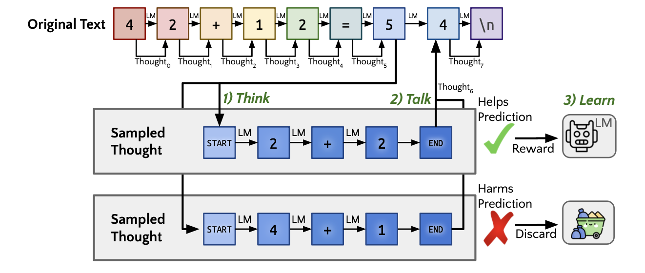 1. 내부 생각 생성: 모델은 각 토큰 사이에 '생각' 토큰을 삽입합니다. 이 토큰들은 모델이 다음에 올 텍스트를 예측하는 데 도움을 줍니다.