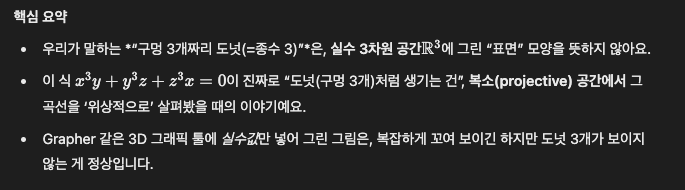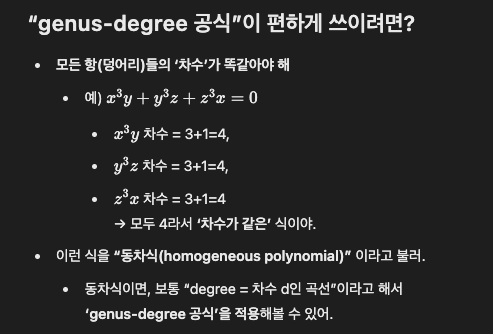 왜 굳이, 막 근의 공식이 있는데 어디서 듣지도 못한 Genus-degree formula를 사용한다고 할까요? 그 이유는 공식에 있었습니다. 각 공식이 x³y + y³z + z³x = 0 이 하필이면 차수가 다 같다 보니 사용되는 공식이라고 합니다. 근의 공식은 x, y, z 찾아야 할 결괏값이 하나일 때만 사용하며, genus-degree formula는 변수가 2개 이상이며, 차수가 다 같을 시 사용되는 공식이라고 합니다. (아닐 시 댓글로 수정 부탁드립니다..)